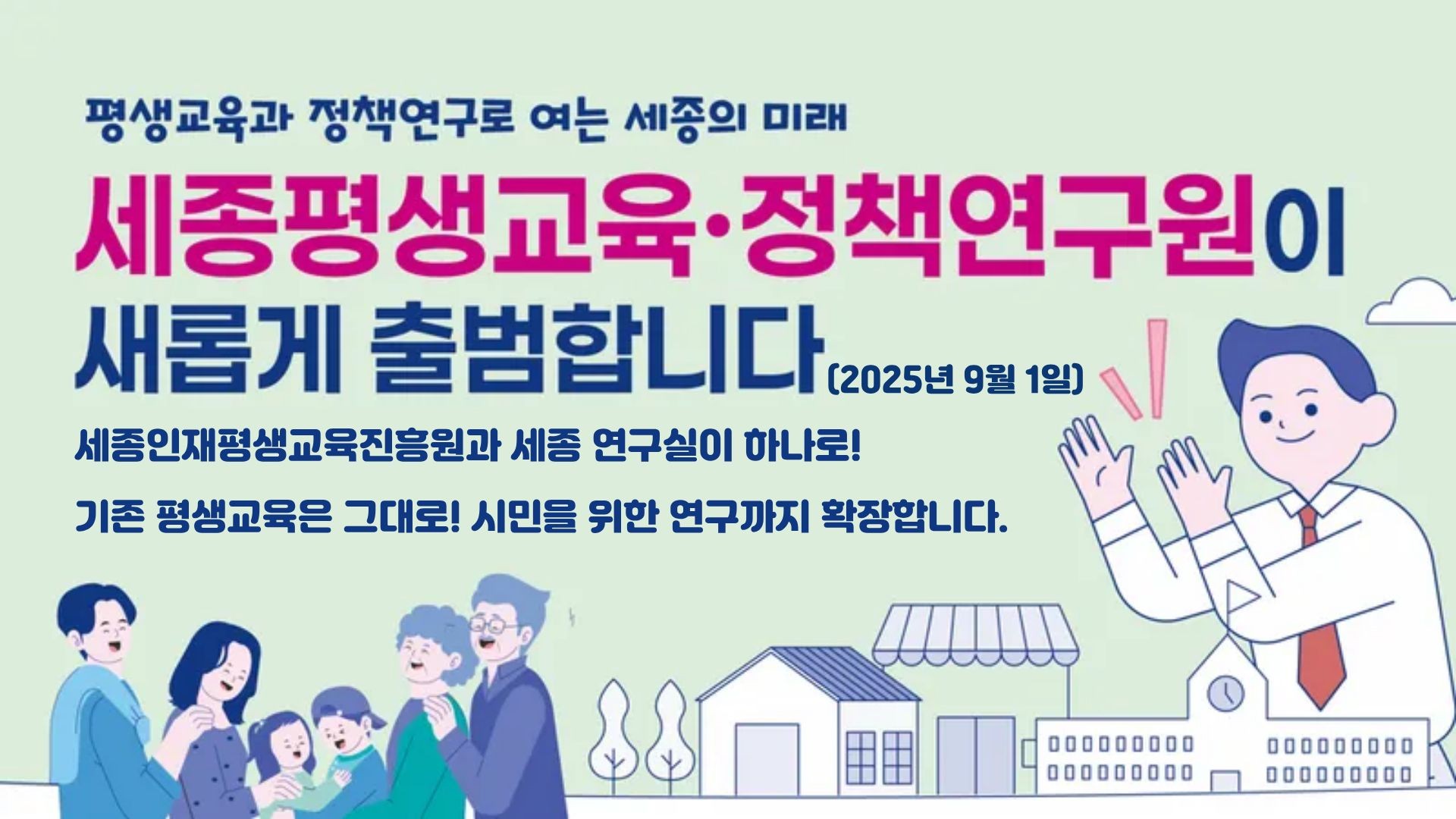2025년 9월 1일 자로 (재)세종인재평생교육진흥원과 세종연구실이 통합되어 (재)세종평생교육·정책연구원으로 새롭게 출범합니다.