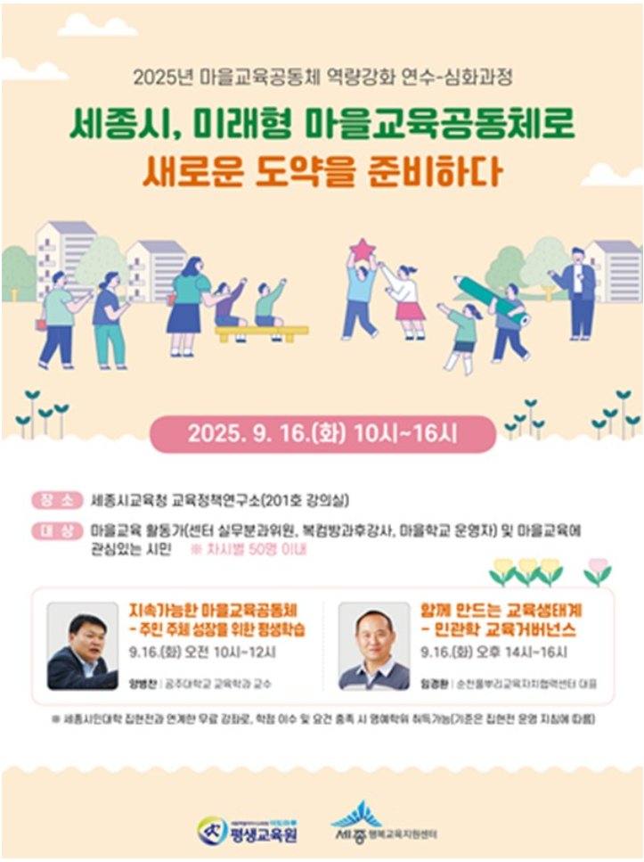 세종특별자치시교육청평생교육원은 오는 16일, 마을교육공동체의 전문성과 지속가능성을 높이기 위해 ‘2025년 마을교육공동체 역량강화 연수를 실시했다.